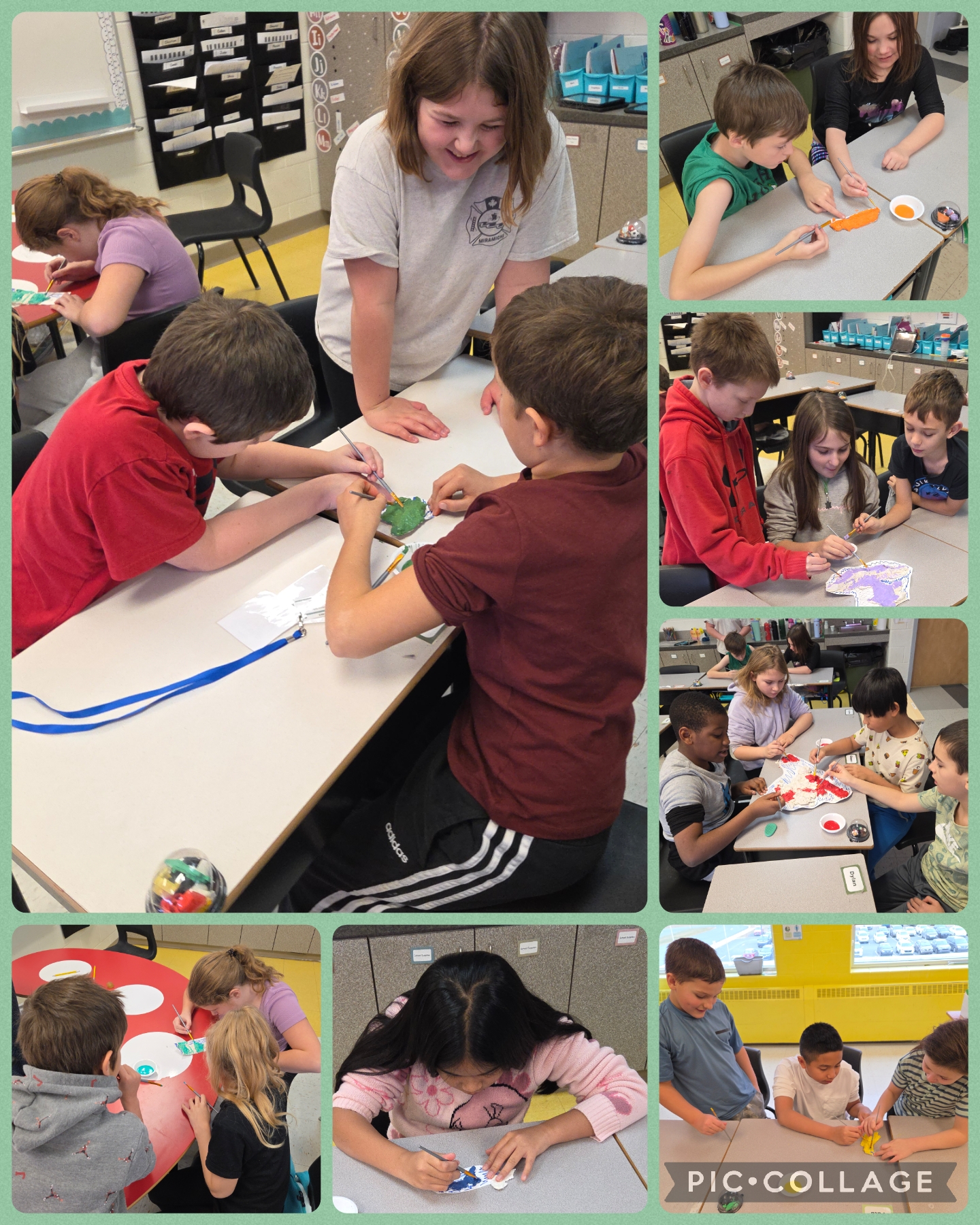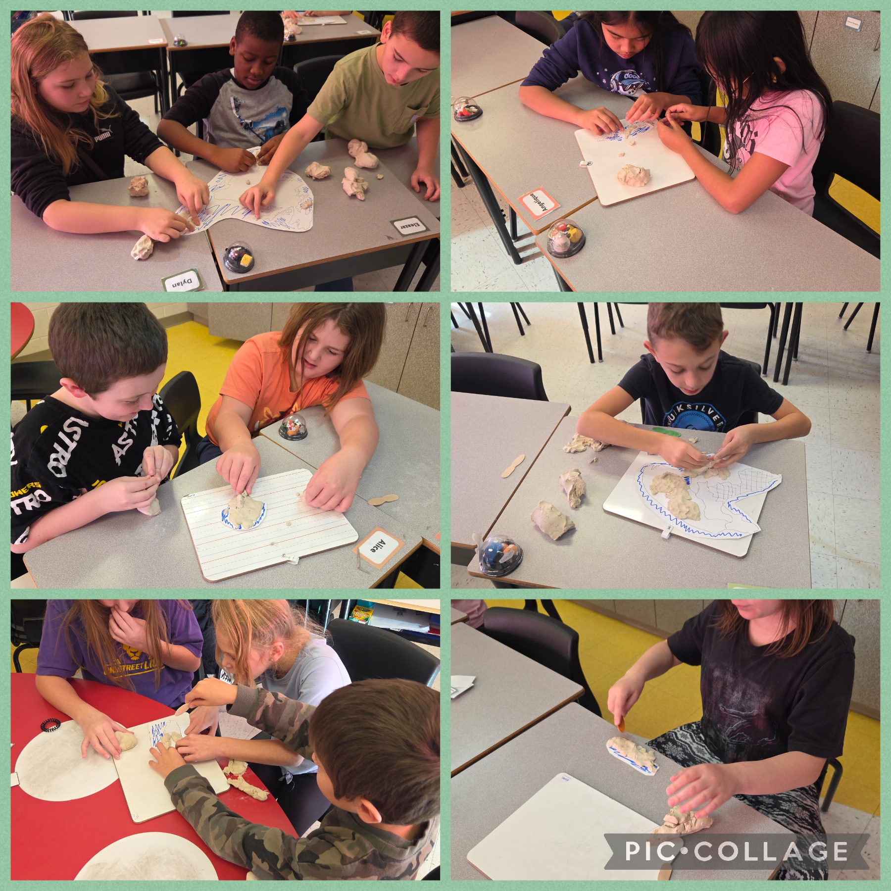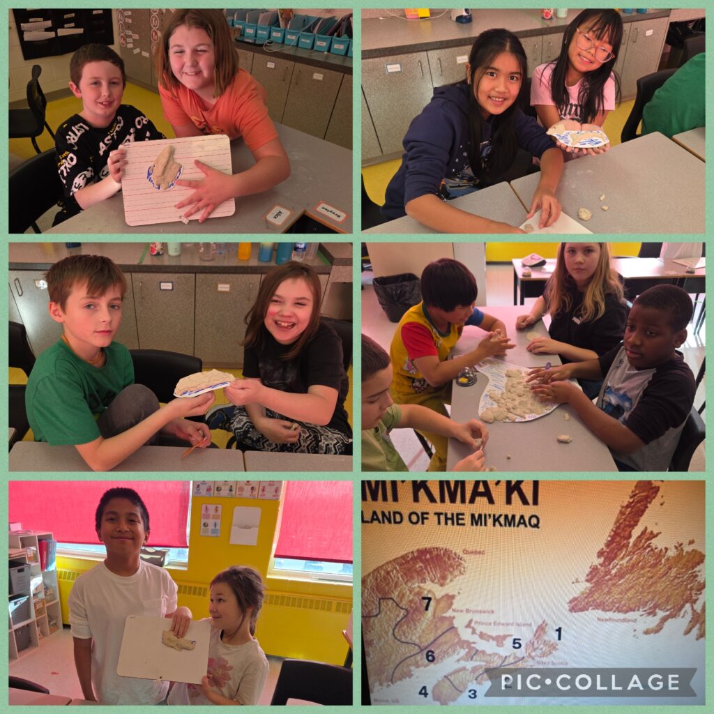 In social studies, students learned about the seven Mi’kmaq territories in eastern Canada. Working in small groups, they used playdough to create detailed maps of one of the seven territories. Afterward, they built elevation maps out of clay and painted them to represent their specific Mi’kmaq territory. Through this creative, collaborative project, students deepened their understanding of geography and Indigenous culture while working effectively together.